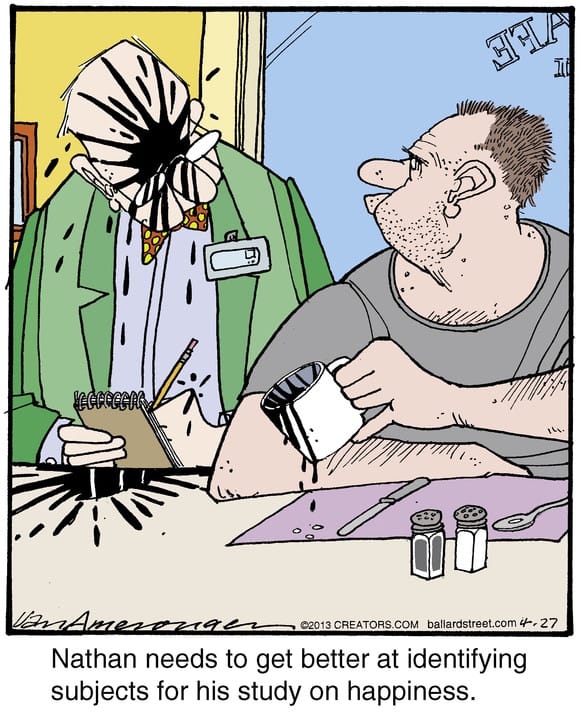 Nathan’s survey technique? Needs work. Maybe don’t question people about happiness before their morning coffee! One splash, one soggy notepad, and a new lesson learned.