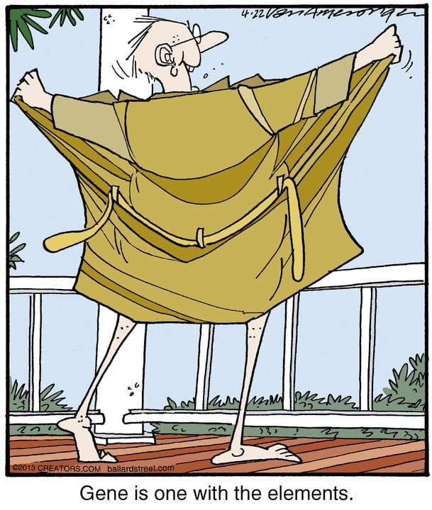 What’s better than a morning on the porch? For Gene, it’s becoming one with the breeze—robe wide open, zen mode activated. It’s a hilarious take on aging fearlessly, and maybe a bit too freely for the neighbors’ comfort.