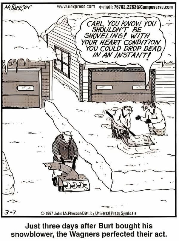 A neighbor exploits a man’s heart condition for snow-clearing theatrics. This passive-aggressive winter warfare comic is peak suburban absurdity.