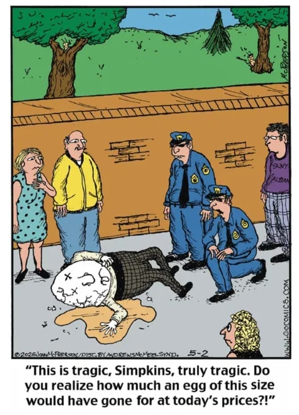 A cracked egg, a chalk outline, and a police commentary on yolk prices. McPherson’s satire mixes nursery rhymes with economic anxiety—cracked, but clever.