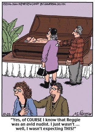 Mourning meets mortification as a nudist is buried… as himself. Few punchlines are this bare-bones and unforgettable.