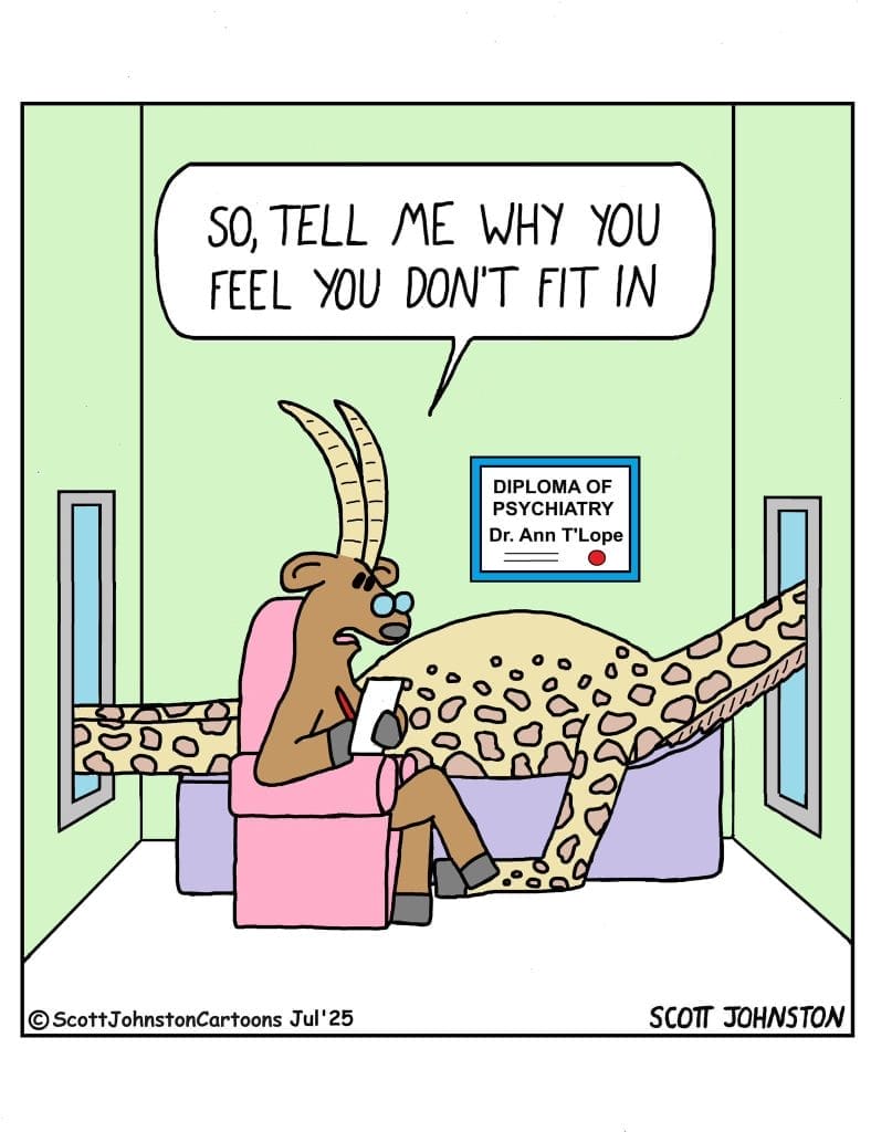 A giraffe sprawls across a psychiatrist’s couch. Talk about struggling to “fit in.” Punchline lands effortlessly.