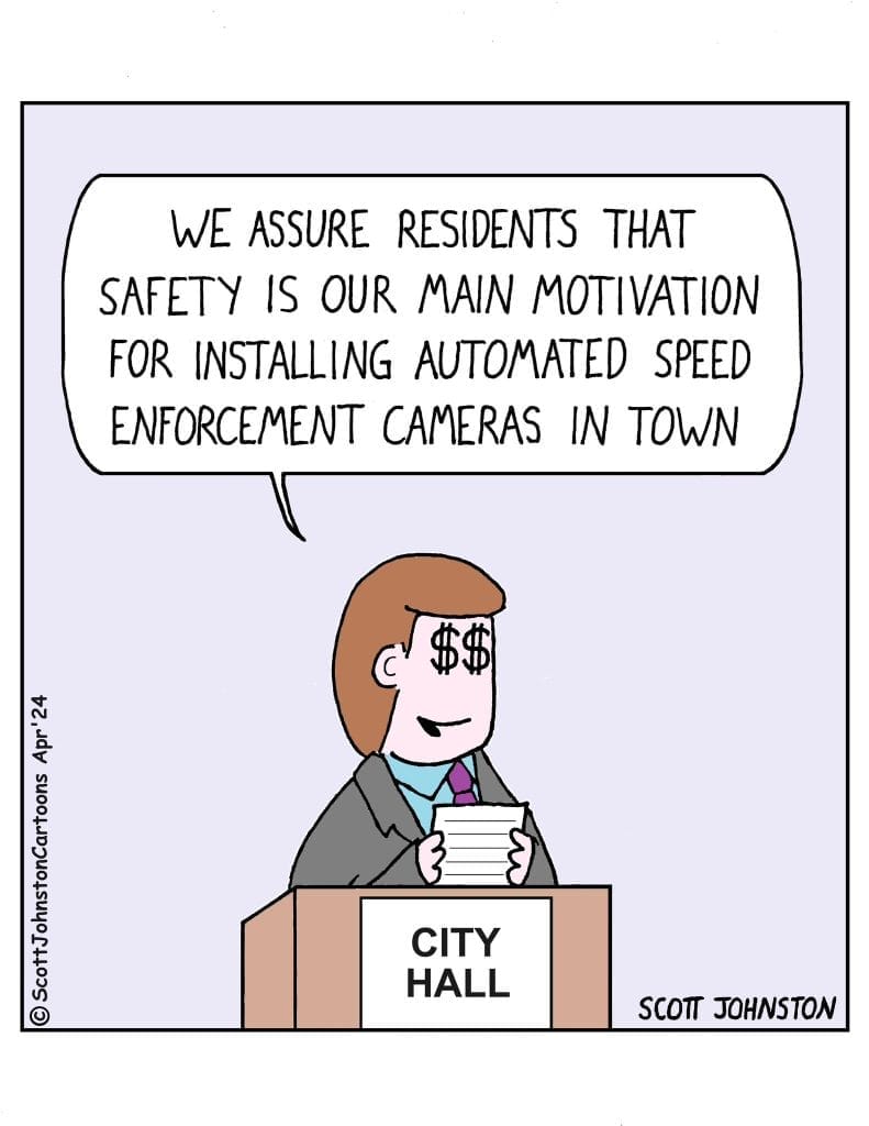 When speed cameras get pitched as “for safety,” Johnston illustrates politicians with dollar-sign eyes. Satire at its sharpest.