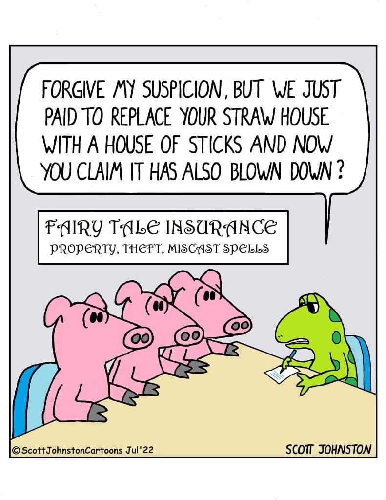 The three little pigs meet with their insurer. Even fairy tale claims can get denied. Brilliant parody.