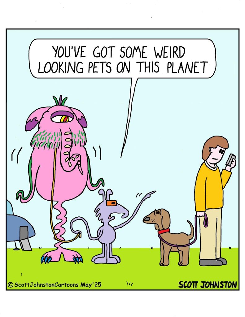 Scott Johnston has carved out a reputation for creating quirky, universally relatable humor. His cartoons often spotlight the ridiculous side of everyday life — from awkward work moments to clever animal observations. Johnston’s style is instantly recognizable: bold outlines, bright colors, and punchlines that hit like a quick one-liner in a stand-up set.