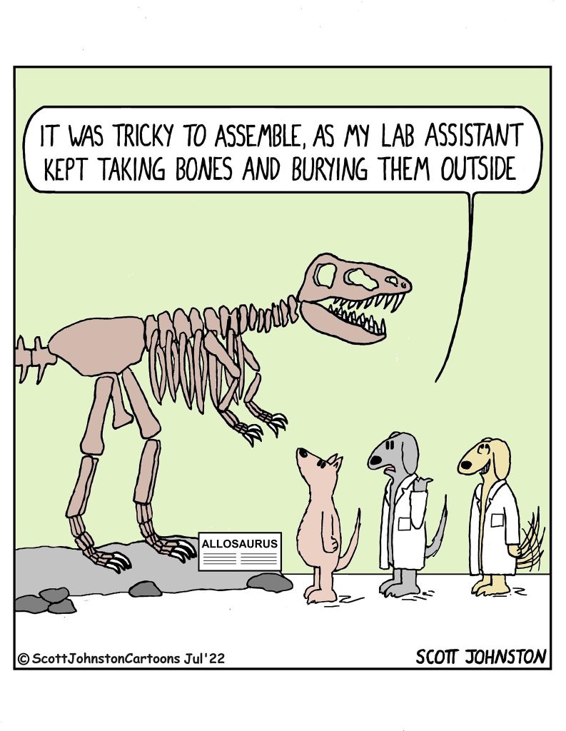 Paleontology gets a canine twist — lab assistants keep burying bones. A perfectly absurd ending to this set.