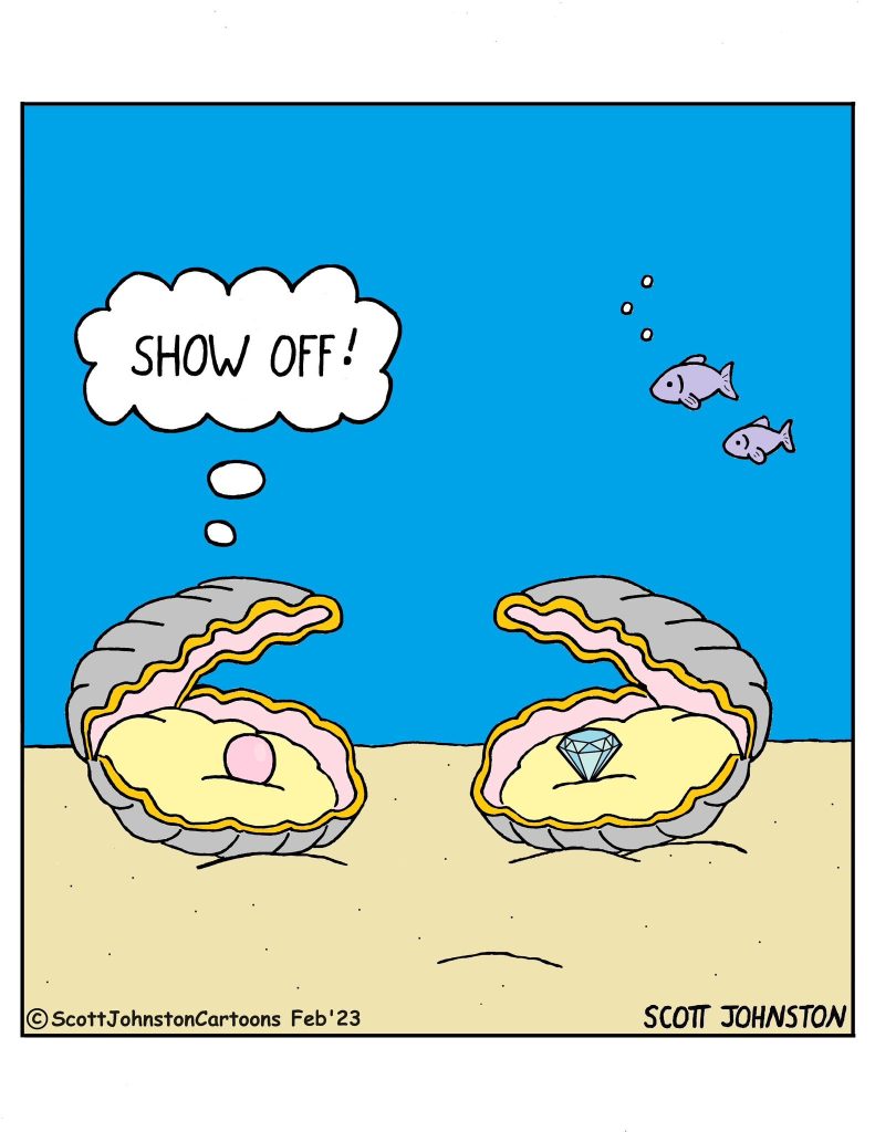 Two clams, one with a pearl, one with a diamond. Naturally, envy bubbles up. Shiny things always stir competition.
