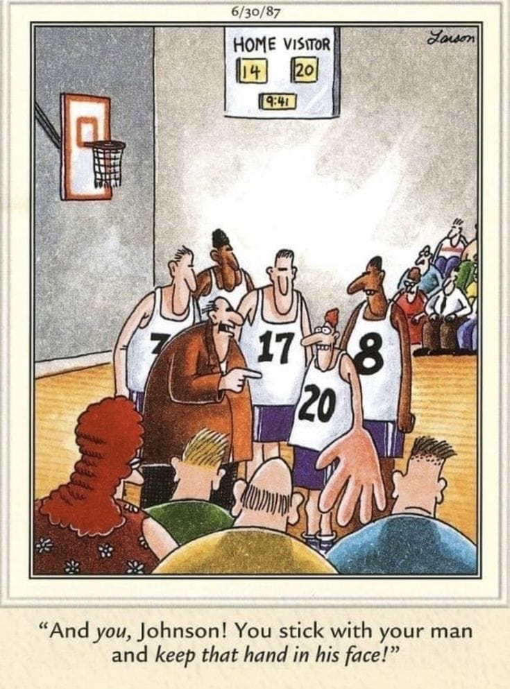 Coach shouts, “Keep that hand in his face!” The punchline? Johnson’s cartoonishly massive hand nearly takes up the whole panel. It’s exaggerated absurdity at its best.