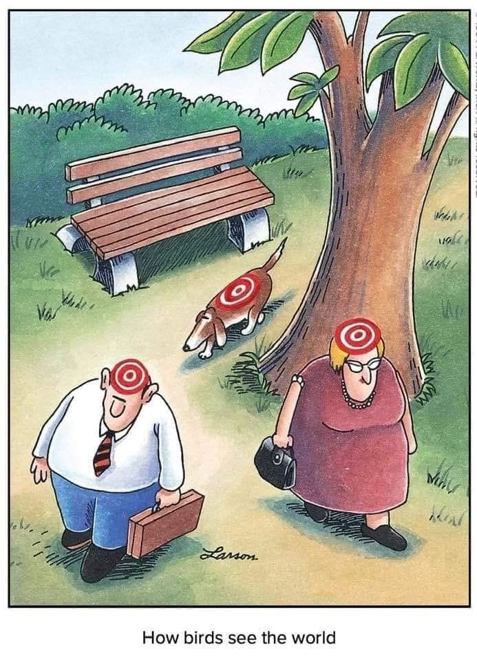 Humans stroll through the park, oblivious to the bullseyes painted on their heads—from a bird’s POV. Larson flips perspectives in the most laughably lethal way.