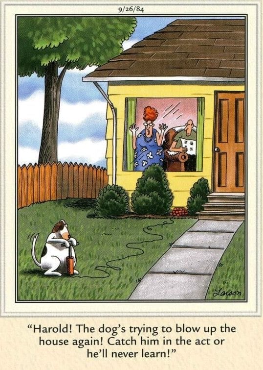 “Harold! The dog’s trying to blow up the house again!” One of the wildest setups yet—because in Larson’s world, even dogs are amateur anarchists.