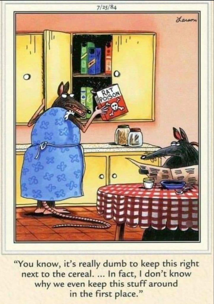 In a rat family kitchen, mom wonders aloud why they keep rat poison near the cereal. It’s meta, it’s dark, and it’s a masterclass in rodent logic.