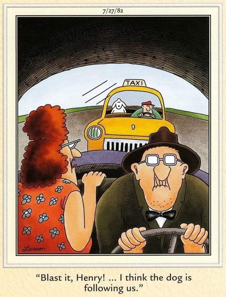 In a surreal twist, a couple in a car panics as a taxi dog “follows” them. Larson turns everyday paranoia into laugh-out-loud absurdity.