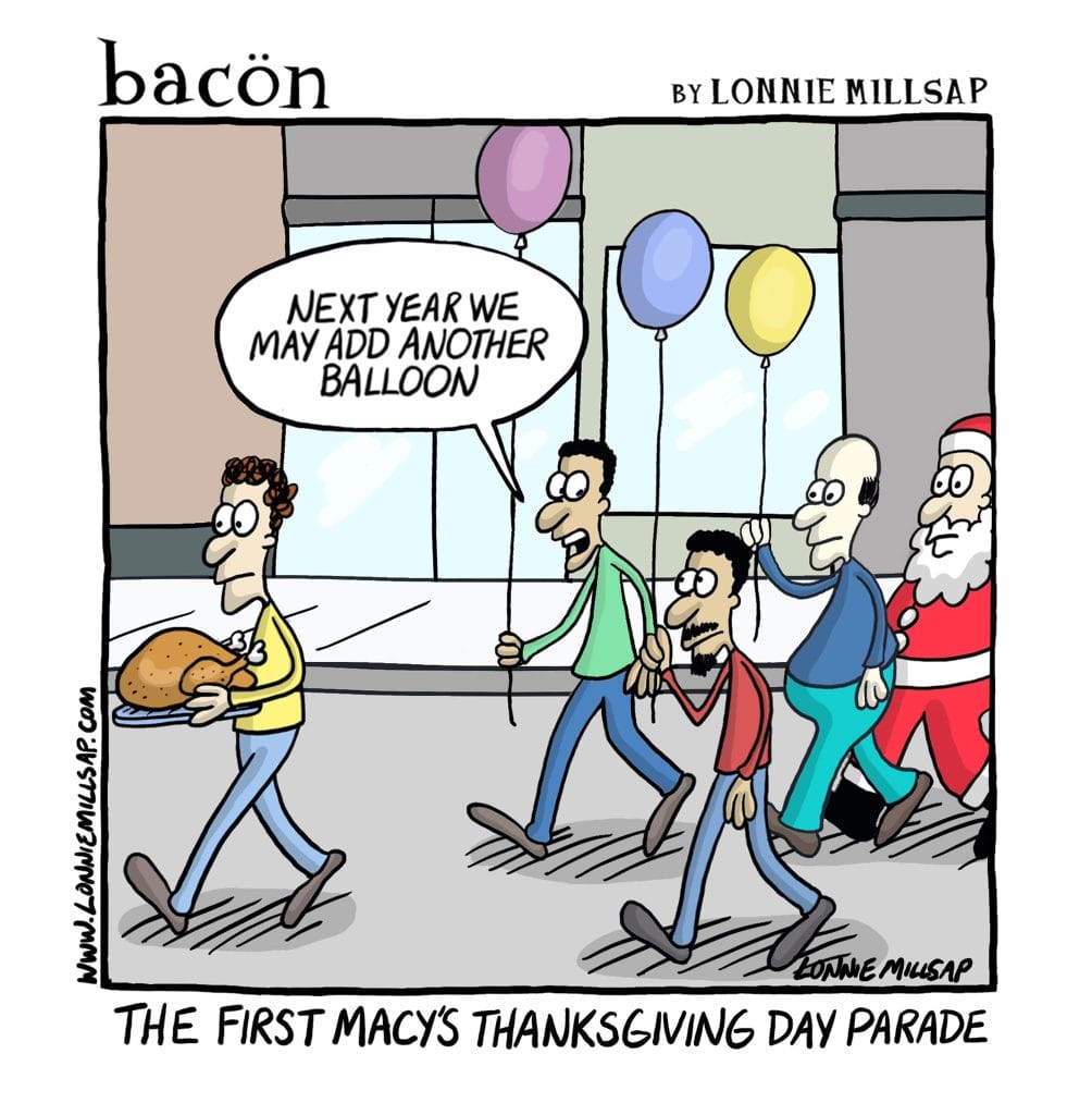 The first Macy’s parade? Apparently, it had more roast turkey than balloons. This comic reimagines history in Lonnie’s signature minimalist-meets-absurdist way. You’ll never look at Thanksgiving the same.