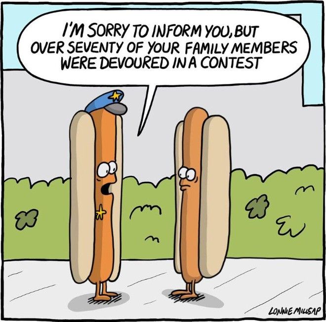 Even hot dogs have families—and Millsap delivers the most tragic police notification you’ll ever see in a cartoon. Yes, over seventy relatives devoured in a contest. It’s so dark, you can’t help but laugh.
