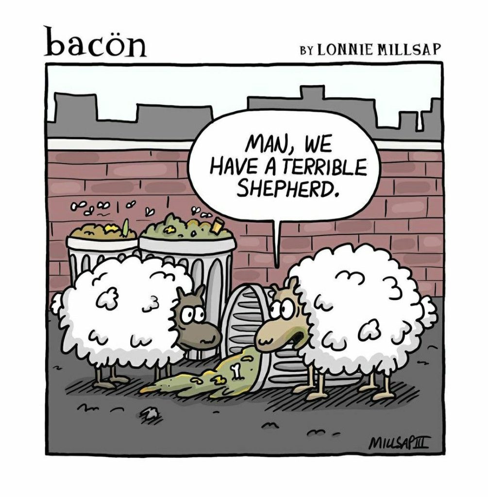 The sheep are raiding trash cans and blaming their shepherd. Millsap’s sheep have attitude, and a total lack of respect for authority. You can almost hear the exasperated sigh from their (probably fired) shepherd.