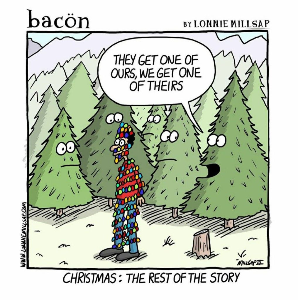 You never see the Christmas tree’s side of things—until now. “They get one of ours, we get one of theirs” reimagines holiday decorating as a bizarre exchange program, complete with anxious-looking pines. Dark holiday humor? Yes, lease
