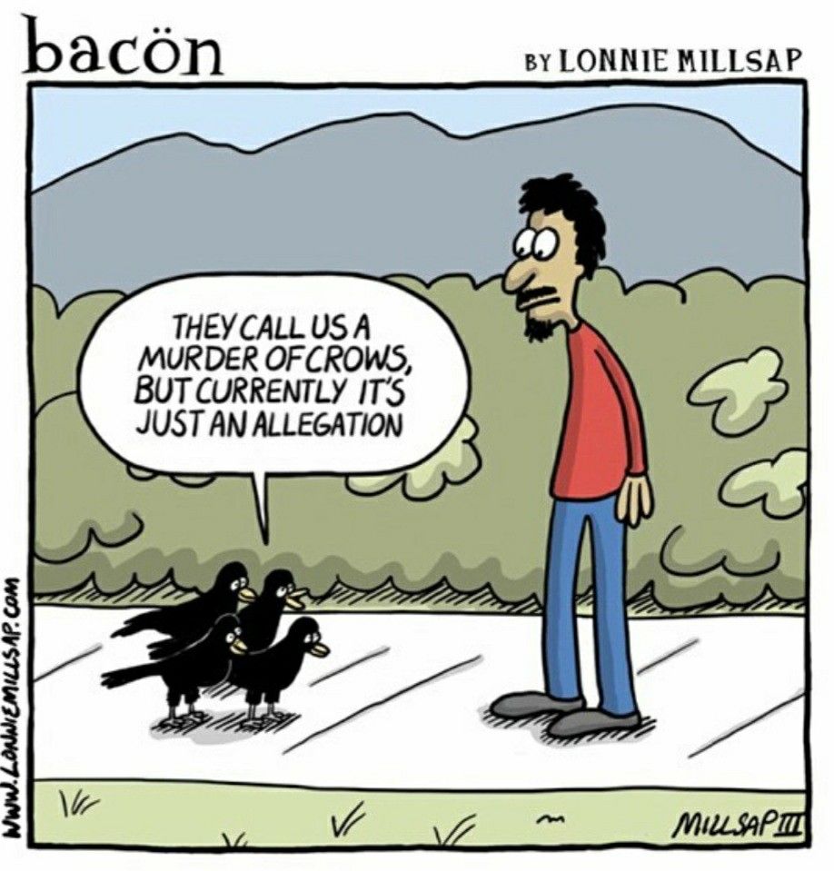 Millsap goes full wordplay here, poking fun at the ominous term “murder of crows.” The crows are just trying to clear their names—it’s all an allegation, officer! A sharp, witty twist that shows off why this comic is among the best webcomics online.