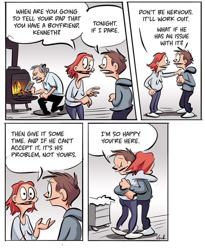 Larsen prides himself on creating a humorous comic strip that showcases the dynamics of adult friendships and relatable everyday situations. His art style is often described as vibrant and full of life, which he considers a great compliment. One of the more personal storylines featured in Bestie is Kenneth’s own coming-out journey, which he approached with humor making it both light-hearted and positive. Reflecting on his younger years, he wishes he had seen more of this kind of representation in the comics he read growing up. Today, he feels proud to contribute such an authentic and positive portrayal of being gay in the world of comic strips.