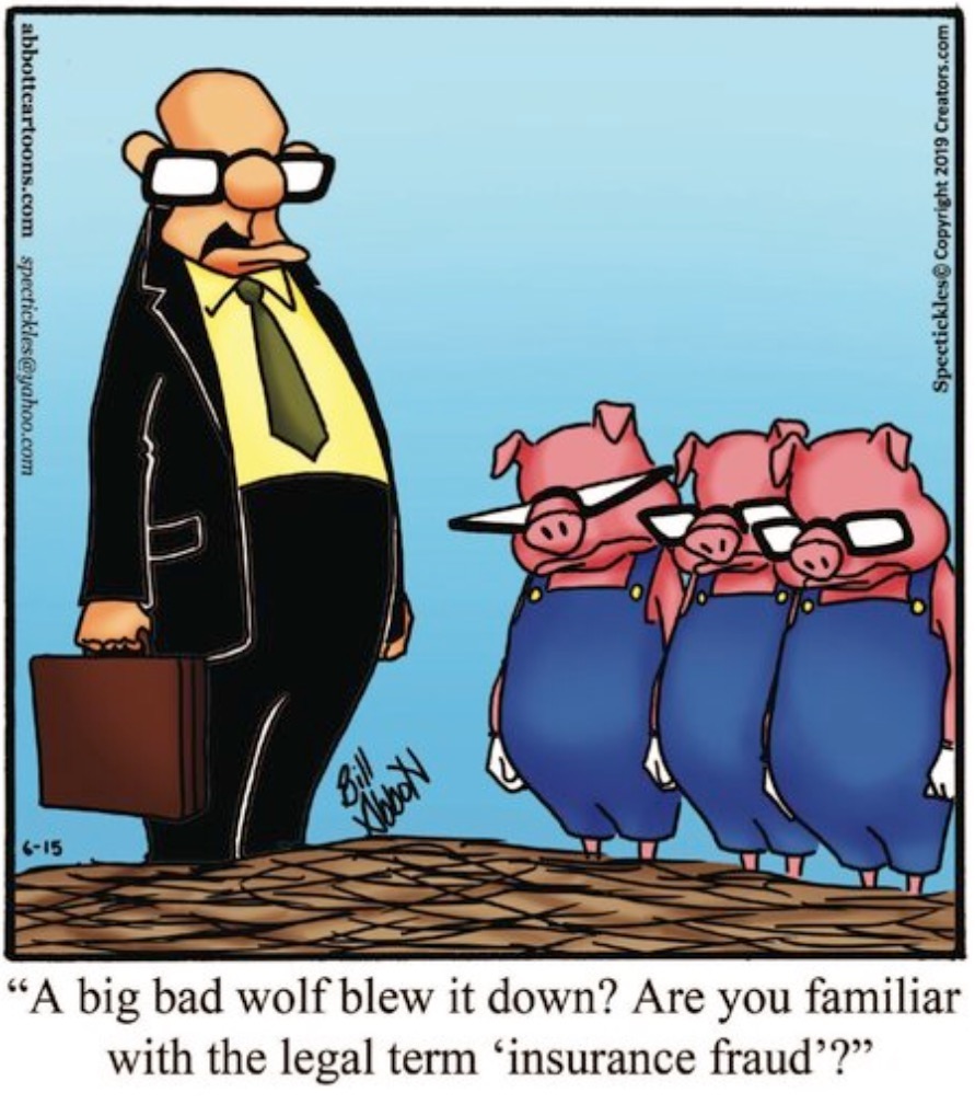 The Three Little Pigs try explaining insurance fraud to a stone-faced investigator. Sorry, boys, “the wolf did it” just won’t cut it anymore.