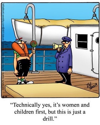 “Women and children first… but this is just a drill.” Even disaster-prep has its comic moments.