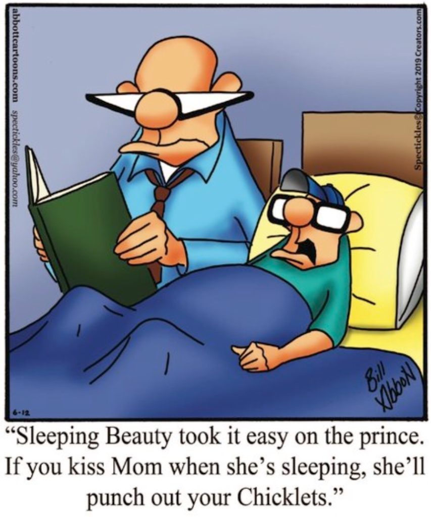 Forget fairy tales: if you try to kiss Mom while she’s sleeping, she’ll punch out your teeth! Modern parenting, cartoon-style.