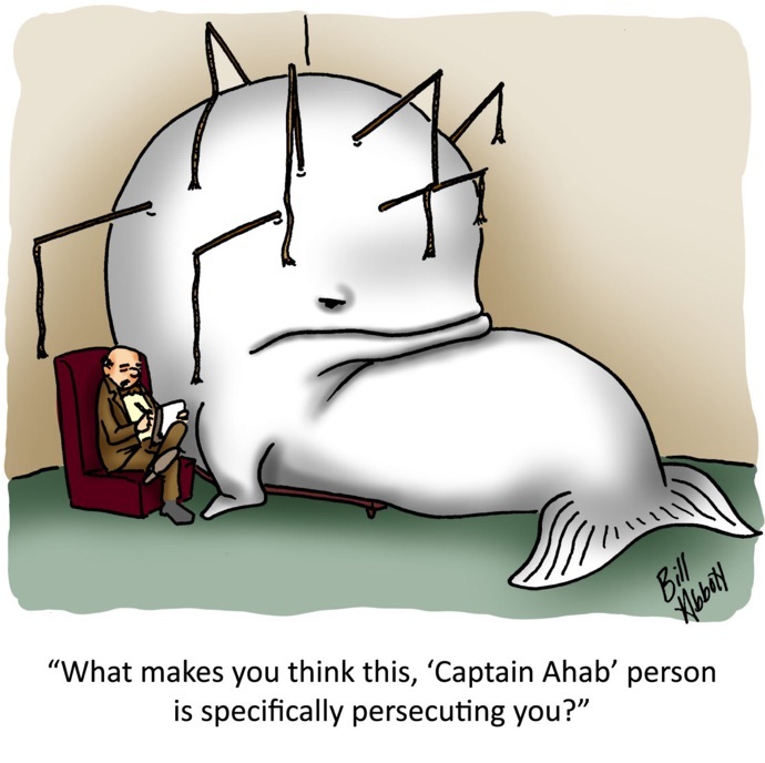 When your shrink’s office is filled with harpoons, you know therapy is getting deep. Even Moby Dick needs someone to vent to about Captain Ahab.
