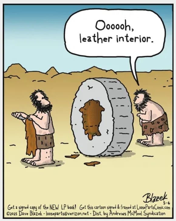 A caveman admires a stone wheel adorned with a slab of leather, declaring it “leather interior.” The joke is brilliantly dumb in the best way — poking fun at materialism and auto culture through a Flintstones lens.