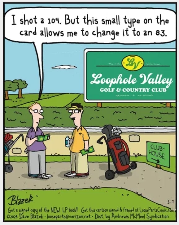 At Loophole Valley Golf Club, a player hilariously uses the card’s fine print to adjust his score from 104 to 83. It’s a cheeky nod to bureaucracy and sportsmanship — or lack thereof. Blazek drives this one home like a comedy pro.
