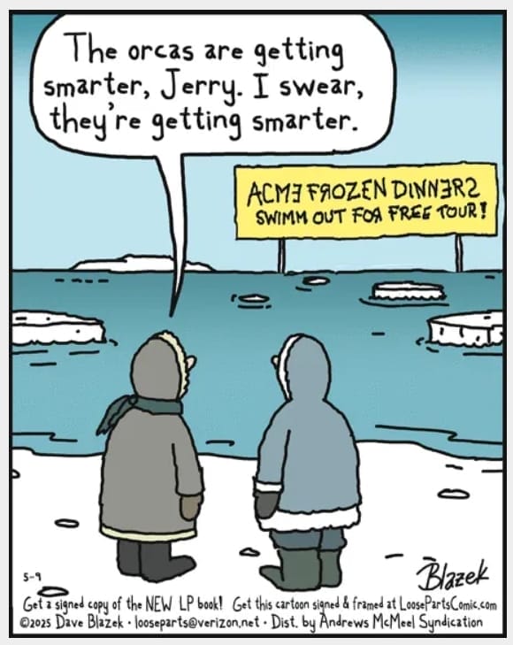 Eskimos observe that orcas are luring people with “Swim Out for a Free Tour” signs. It’s both ridiculous and smart — a commentary on evolution and entrapment dressed as arctic banter. Absolutely killer (pun intended).