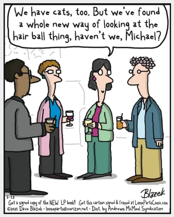 This comic parodies how far pet people go to justify feline quirks. One couple redefines hairballs as something practically divine. It’s that niche pet-owner humor that’s just exaggerated enough to be spot-on.