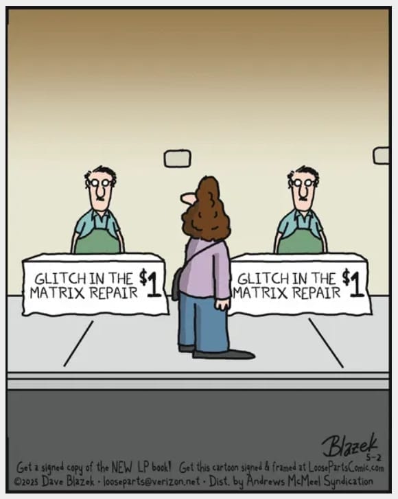 This panel features three identical repair booths, each offering “Glitch in the Matrix Repair” for a dollar. The sheer repetition is the joke — and it nails that unsettling, funny feeling of being caught in an absurd loop. Meta and marvelous.