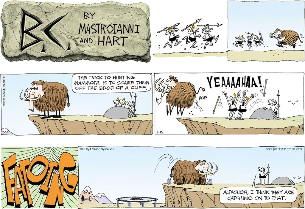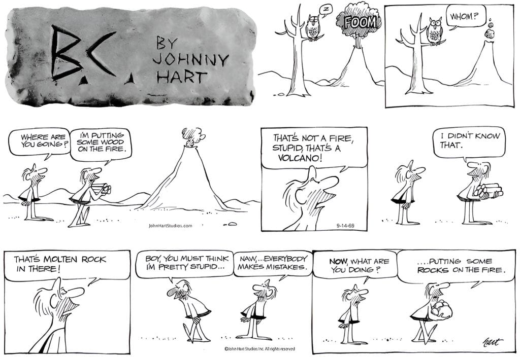 In a case of prehistoric confusion, a caveman sees a volcano and casually decides to “add some wood to the fire.” When informed it’s molten rock, not a cozy campfire, he responds by switching strategies: “putting rocks on the fire.” The gag builds beautifully, stacking stupidity on top of misunderstanding until it explodes in laughter. Classic BC logic—stone-cold hilarious.
