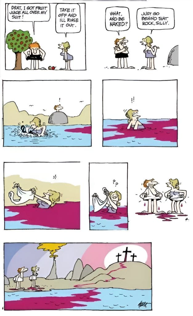 A fruit juice mishap leads to a strip filled with visual chaos, wardrobe malfunctions, and biblical symbolism—all without a single punchline. The storytelling is all in the imagery, from stained robes to rivers of juice leading to a trio of crosses. It’s both goofy and profound—a comic that invites laughs and double takes.