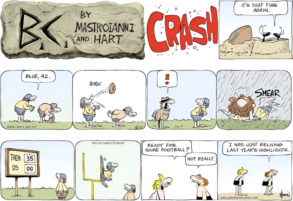 Stone-age football is as violent as you’d expect, and when one caveman replays last year’s “highlights,” they’re full of fumbles and body slams. The best panel? A caveman wedged in the goalpost. The commentary hits home for sports fans who’ve suffered through one too many disastrous seasons.
