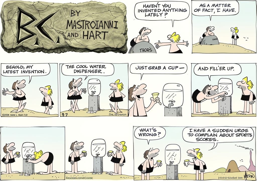 Thor proudly introduces the newest invention: the cool water dispenser. After a drink, one caveman says he suddenly wants to complain about sports scores. The clever jab at modern office culture—via prehistoric logic—is peak BC brilliance. This one’s for all the watercooler warriors out there.