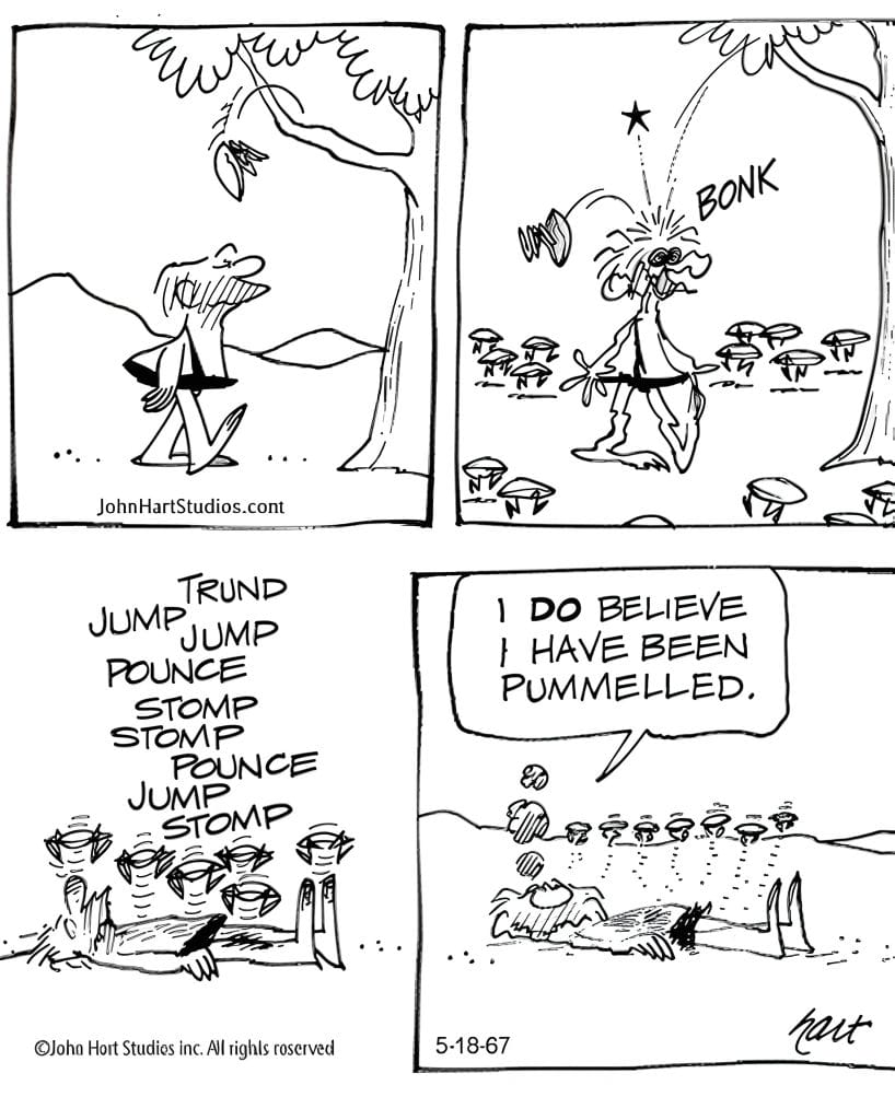 Our caveman hero gets bonked by a mushroom and stomped by an angry mob of tiny fungi. His dry, post-trampling remark: “I do believe I have been pummelled.” This strip lives and breathes understatement comedy—and it pummels the funny bone in the best way.