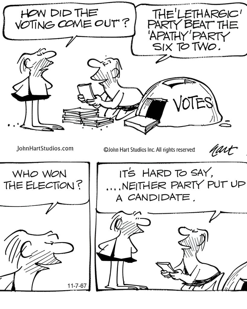 Election day in the Stone Age doesn’t inspire much excitement. The ‘Lethargic Party’ defeats the ‘Apathy Party,’ but no one wins because… no candidates showed up. It’s a satirical jab at voter disillusionment that sadly still hits home. Hilariously cynical, it wraps social commentary in prehistoric packaging.