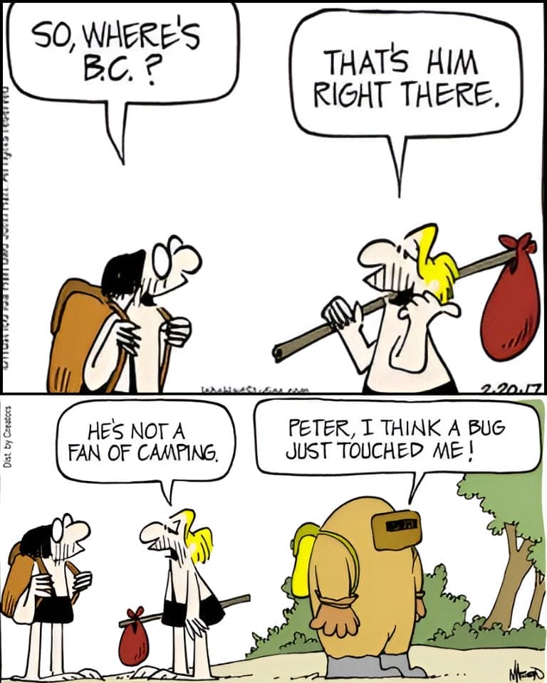 When one friend wonders why B.C. isn’t enjoying the great outdoors, the answer is revealed visually: he’s in full hazmat-level camping gear. The contrast between primitive times and modern camping paranoia makes this a comic that still resonates with reluctant campers everywhere.