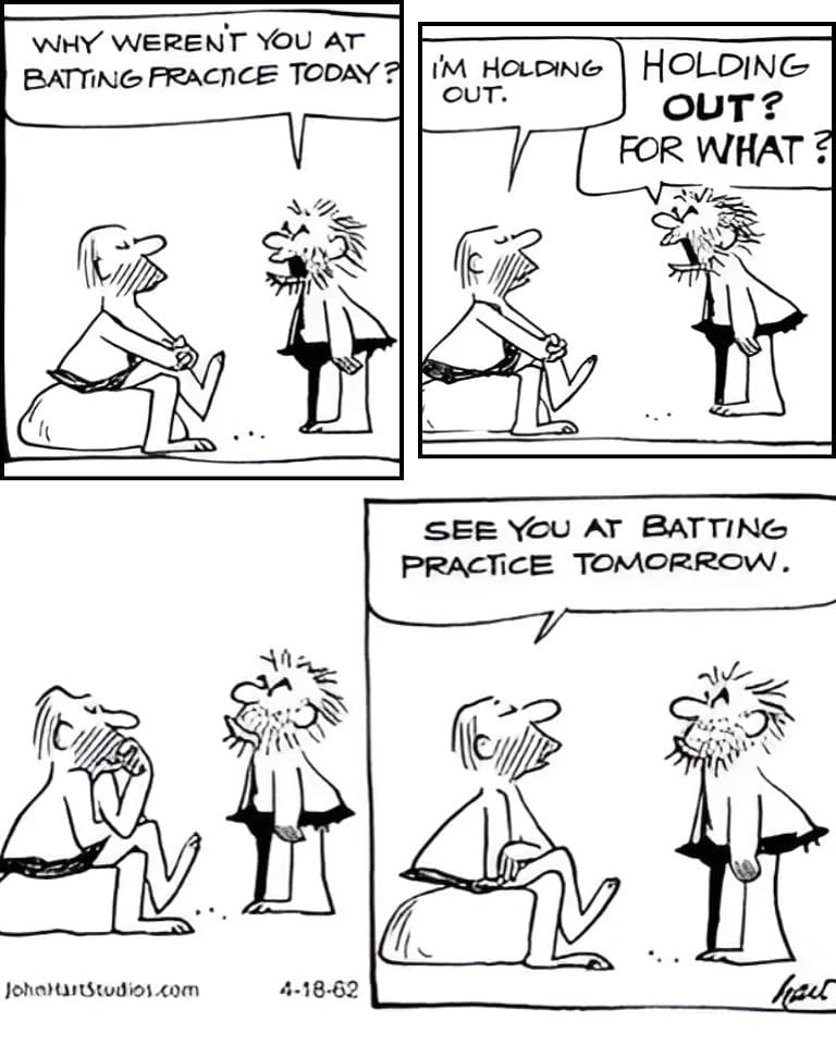 One caveman skips practice due to a silent strike. When asked what he’s holding out for, the conversation fizzles hilariously. It’s a subtle nod to modern sports culture wrapped in prehistoric clothing—cleverly bringing labor disputes to the Stone Age.