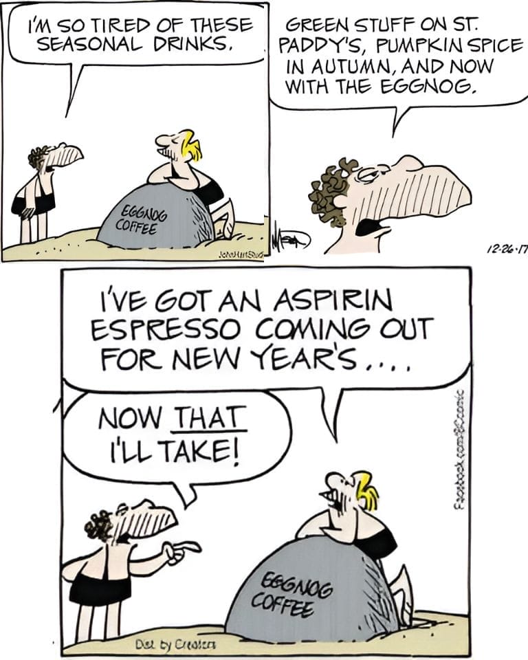 Sick of seasonal fads, a character complains about pumpkin spice and eggnog. The punchline? An aspirin espresso for New Year’s. The absurdity of cavemen critiquing coffee trends is peak Hart, and it somehow makes perfect sense.