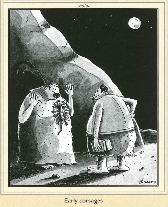 “Early corsages” involve a man gifting his date a bouquet still clinging to a small critter. Romance was complicated in the caveman era.