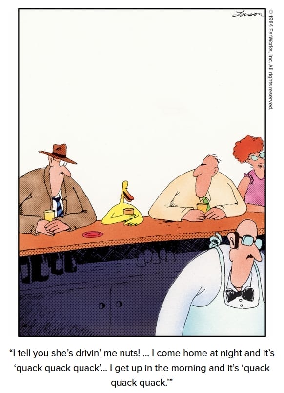 A man vents at a bar about his nagging wife… who happens to be a duck. Larson’s punchline is in the relentless “quack quack quack.”