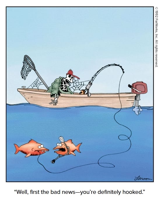 Two fish, one hook, and a long-dead fisherman. The grim reaper of fishing jokes doesn’t get darker (or funnier) than this.