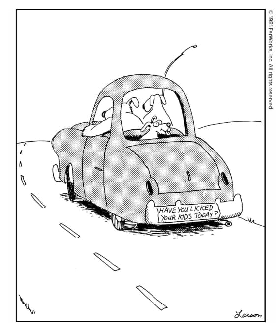 That bumper sticker: “Have you licked your kids today?” Yep, only Larson would flip the wholesome into canine comedy gold.
