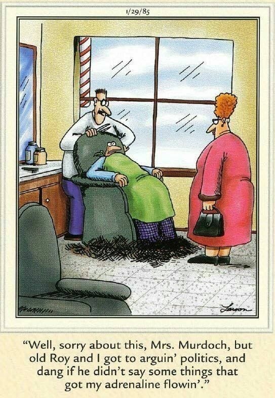 A barber distracted by politics turns his customer into an accidental buzz-cut victim. Proof that arguments about politics are never safe.