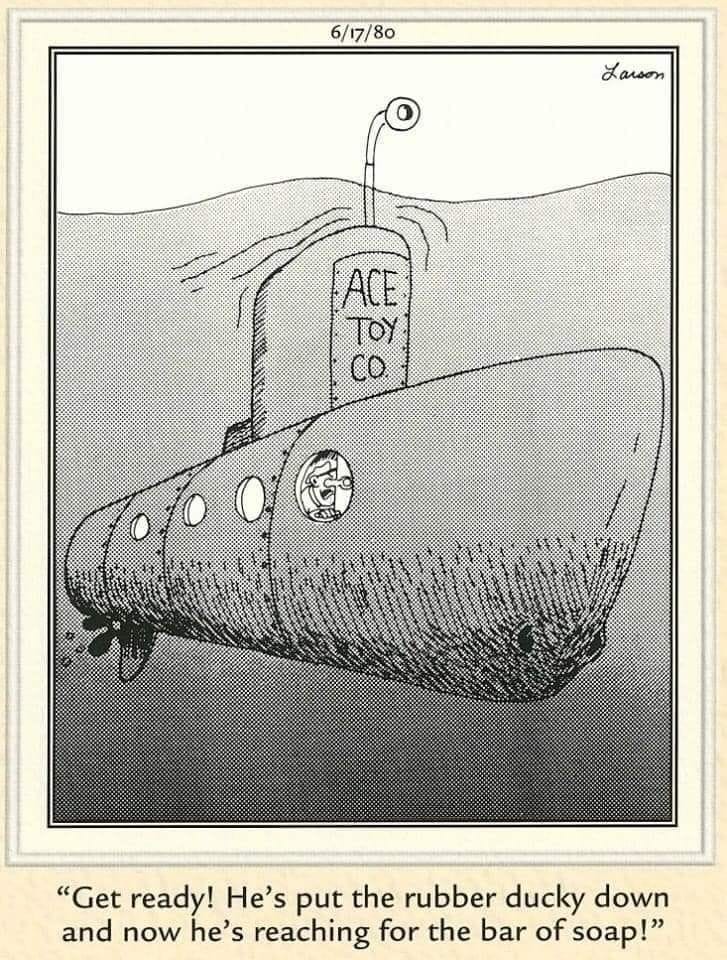 A bath toy submarine crew reacts to a child reaching for the soap. Suddenly, bath time is a military operation.