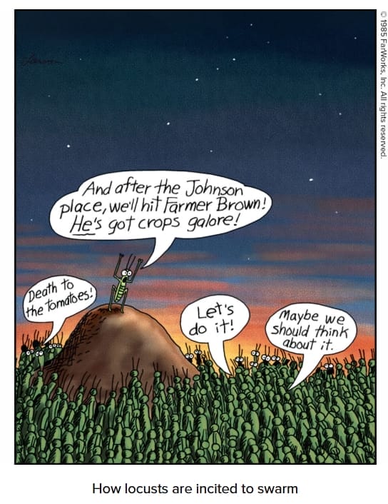 Locusts planning a crop invasion like a medieval army is peak Larson. Bonus points for the dramatic rally cry: “Death to the tomatoes!”