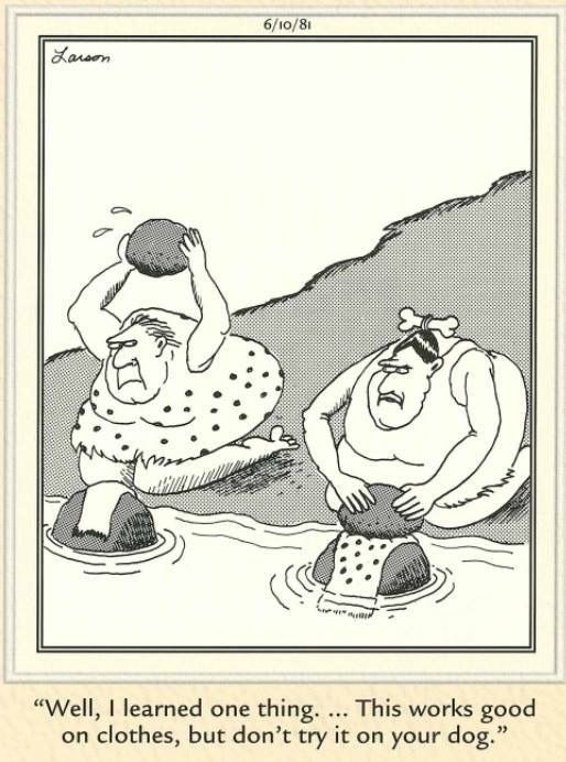 Stone Age couples beating laundry on rocks… and learning the hard way that dogs don’t wash the same way.