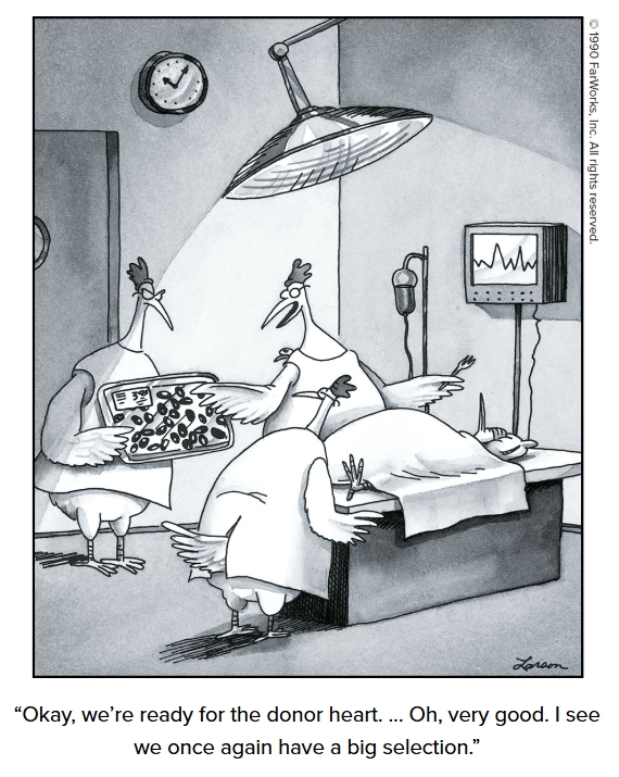 Doctors as chickens in an operating room, picking from a tray of hearts. It’s gruesome, bizarre, and laugh-out-loud surreal.