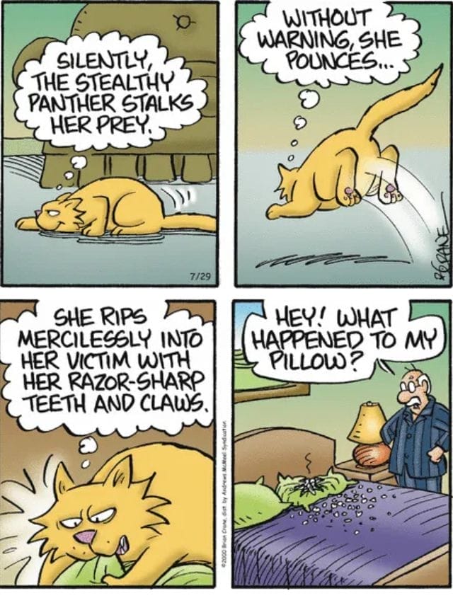 A cat’s wild instincts unleash on a poor, defenseless pillow—reminding us that every housecat is just a jungle panther in disguise. The punchline? “What happened to my pillow?” Cat owners, beware.